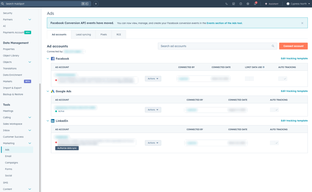 Before you start syncing your audiences, you’ll need to make sure your Facebook Ads, Google Ads, and LinkedIn Ads accounts are all properly connected to HubSpot. Those connections let HubSpot send audience data directly to your ad platforms for focused targeting. If you don’t have your ad platforms connected yet, no worries! We have instructions below that you can follow.