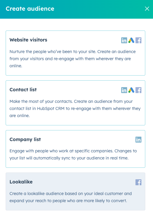 You may choose to use an ABM strategy to focus on certain companies or industries. HubSpot lists let you target your ads and messaging to them specifically.