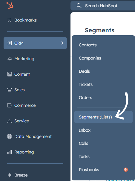 - Navigate to “CRM” in the left side panel of HubSpot, select “Segments (Lists)” and then click “Create segment”